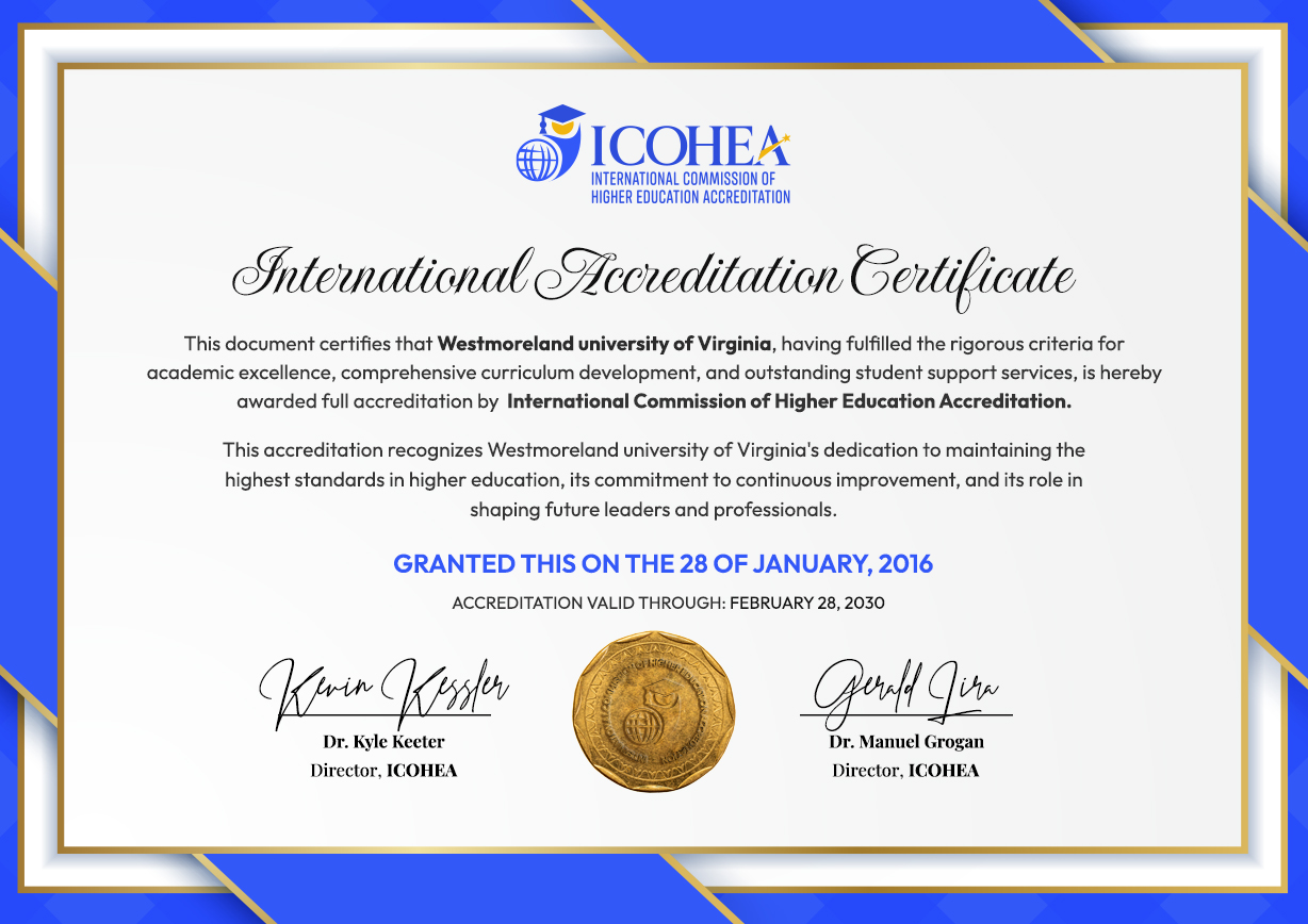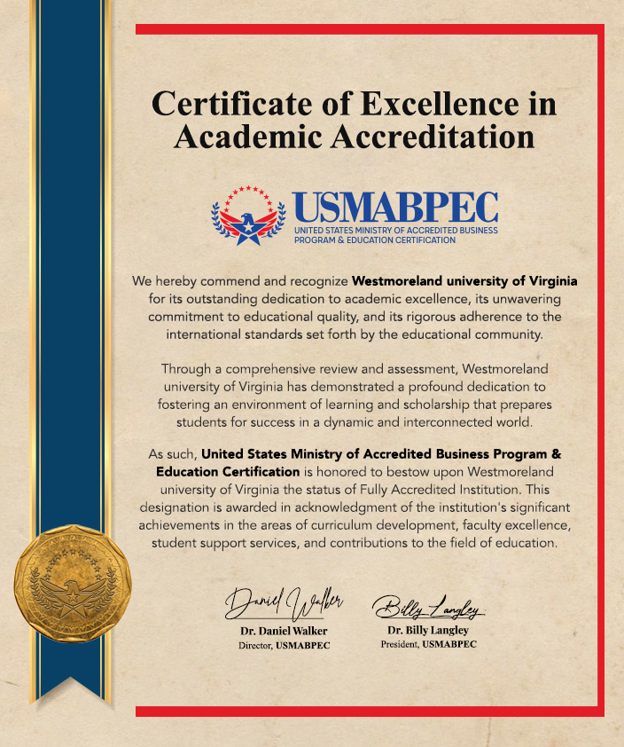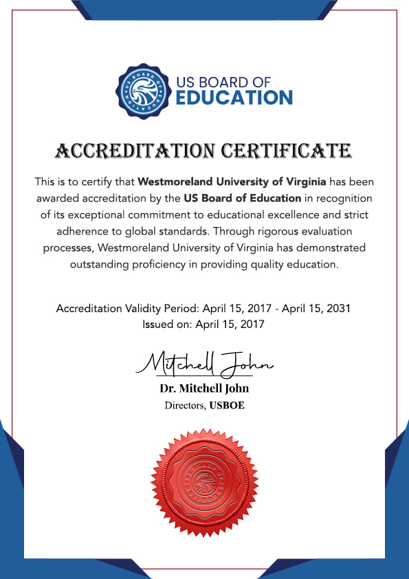 Westmoreland University of Virginia is an internationally recognized and accredited distance learning university. We have received certifications from multiple international accreditation bodies, continually advancing our online programs and courses to ensure our students receive the best distance learning experience.